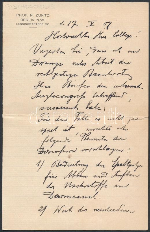 1907 Prof. N. Zuntz pszichológus fejléces leve Prof. Ferdinand v. Klu...