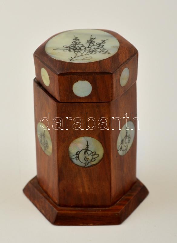 Gyöngyház berakásos fa ékszertartó, kézzel rajzolt, m:8,5 cm