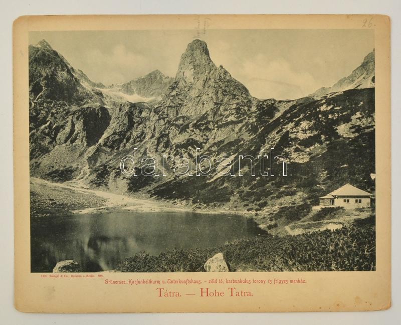 1898 Tátra, Zöld-tó, Karbunkulus torony Frigyes menház, fotónyomat, Stengel & Co. Nr. 8951, karton, 24x30,5 cm / Tatra, lake, mountain, rest house
