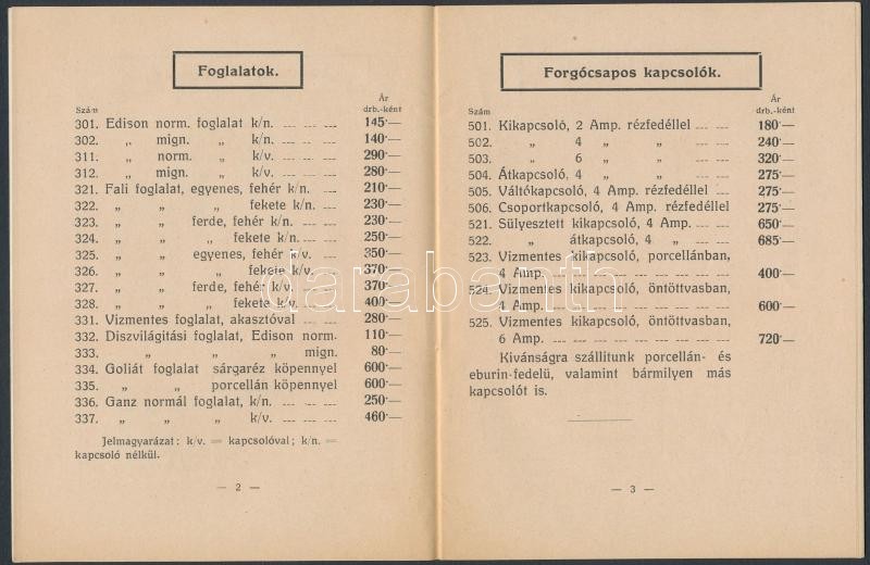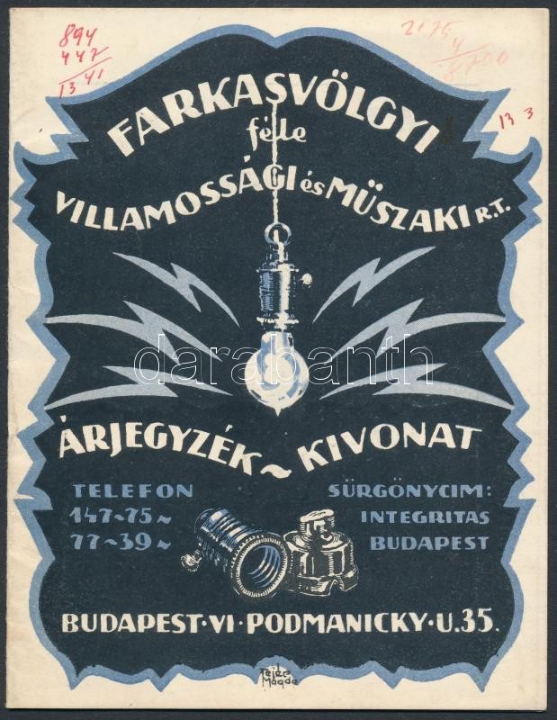 cca 1920 Farkasvölgyi-féle Villamossági és Műszaki Rt. árjegyzéke, 16 ...