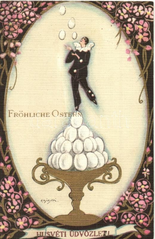 Fröhliche Ostern / Easter greeting card with egg throwing clown, Italian art postcard, Ballerini & Fratini 178 s: Chiostri