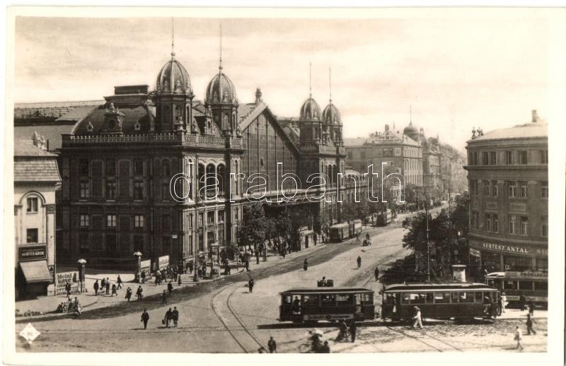 Budapest VI. Nyugati pályaudvar, villamosok, Meinl kávé reklám, hentes, Heilig harisnyaháza, Kertész Antal üzlete