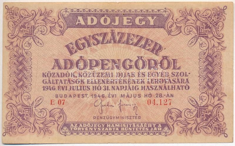 1946. 100.000AP vízjeles papíron, sorszámozott, függőleges papírráncca...