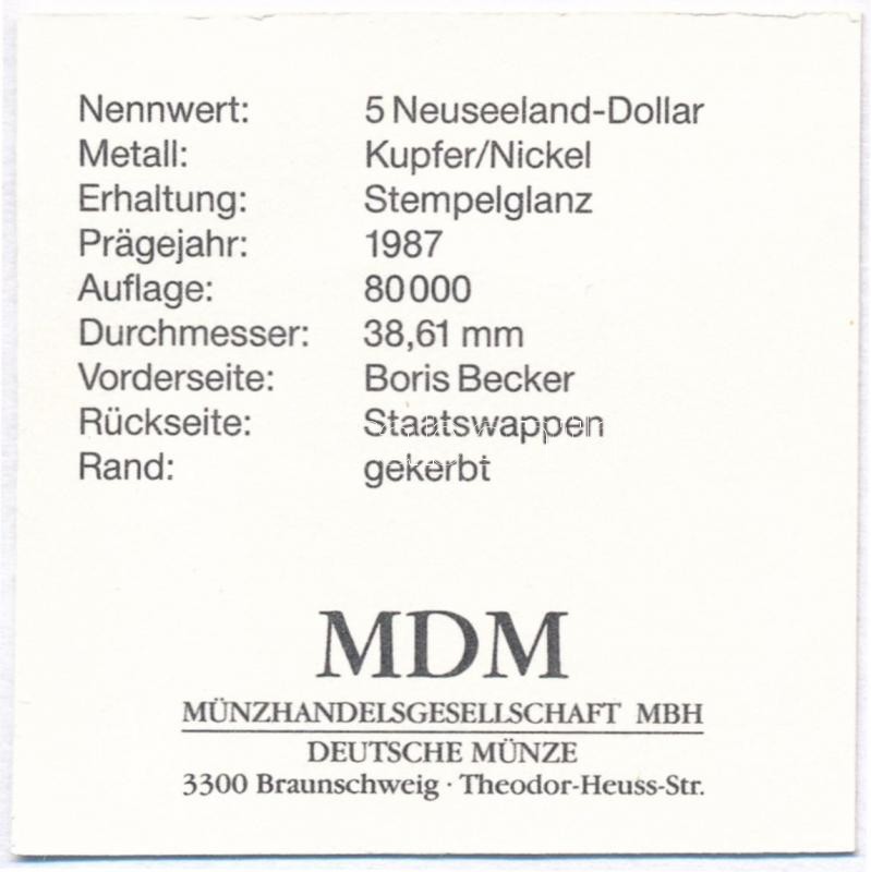 Description: Niue 1987. 5$ Cu-Ni "24. Olimpiai Tenisz Játékok Szöul - Boris Becker" tanúsítvánnyal T:1-,2