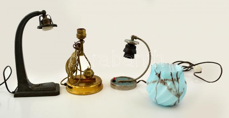 3 db asztali lámpa, kis hiánnyal, az egyik burával, közte réz is, különböző méretben