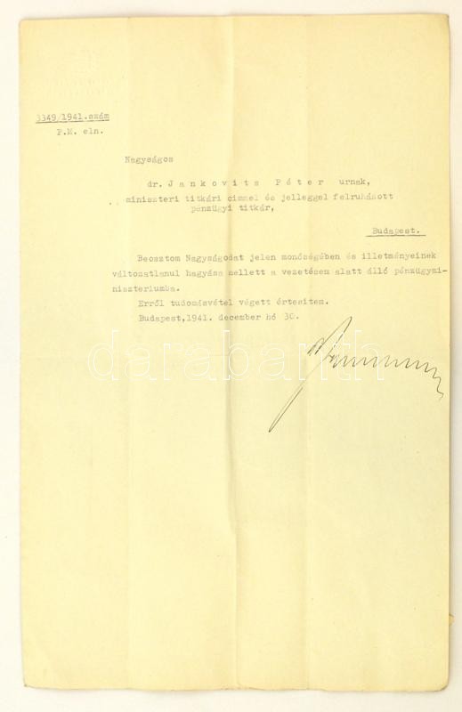 1941 Bp., Reményi-Schneller Lajos(1892-1946) pénzügyminiszter saját kezű aláírása kinevezési okmányon, a minisztérium szárazpecsétjével