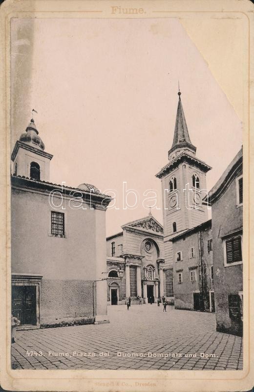 cca 1890-1900 Fiume, Piazze del Duomo (Szűz Mária Mennybemenetele templom), Stengel & Co. 4743., kartonra kasírozva, sérült, hiánnyal az egyik sarkánál, 14.5x9.5 cm. / cca 1890-1900 Fiume, Piazza del Duomo (Saint Mary of the Assumption Chruch, Stengel & Co. 4743., on board, 14.5x9.5 cm.