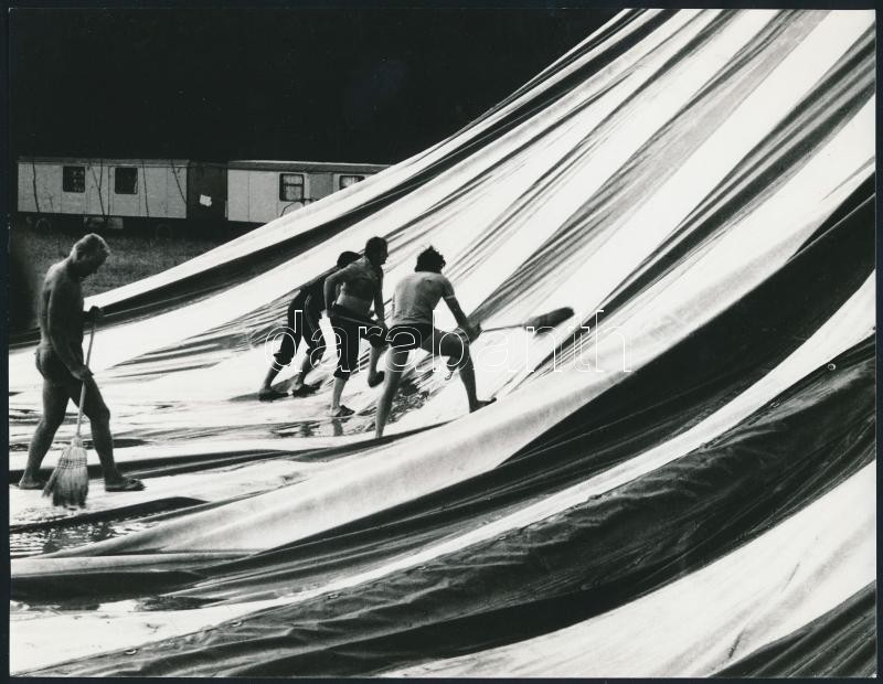 cca 1970 Vándorcirkusz sátrának takarítása, feliratozott vintage fotó ...