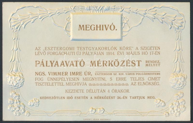 1914 Az Esztergomi Testgyakorlók Köre által kiadott szecessziós stílusú meghívó az esztergomi sportpálya pályaavató mérkőzésére