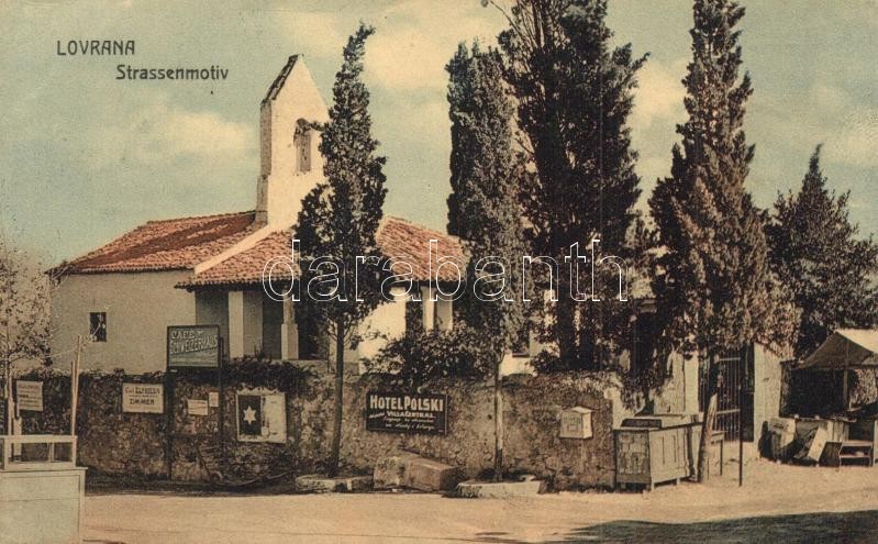 Lovran, Lovrana; Strassemotiv / street view with Hotel Polski, Cafe Sc...