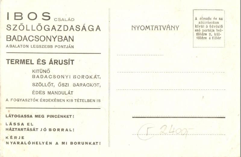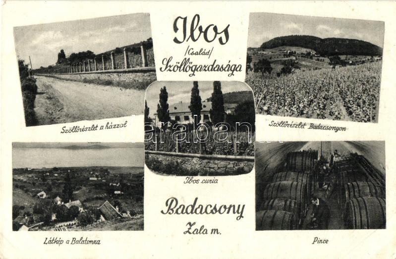 Badacsony, Ibos család szőlőgazdasága, borszállítás, Ibos kúria, látkép, régi pince, öreg présház, a hátoldalon a szőlészet reklámjával (EK)
