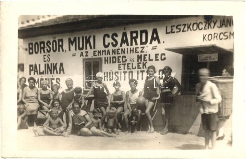 Budapest III. Óbuda, Északi vasúti összekötő híd után, Leszkóczky János Muki csárdája, vendéglő a Duna parton, strandolók csoportképe, photo