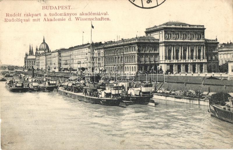 Budapest V. Rudolf rakpart, Magyar Tudományos Akadémia, uszályok, gőzh...