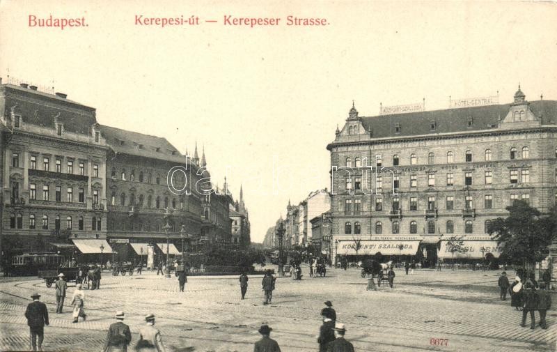 Budapest VII. Kerepesi út, Baross tér, Központi szálloda és étterem, József Főherceg szálloda, villamosok, Taussig A. kiadása (EK)