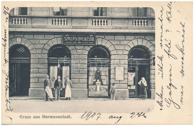 Nagyszeben, Hermannstadt, Sibiu; Török József utóda, Szőllősi Boldizsár fodrászüzlete / barber shop, hairdresser salon (EK)
