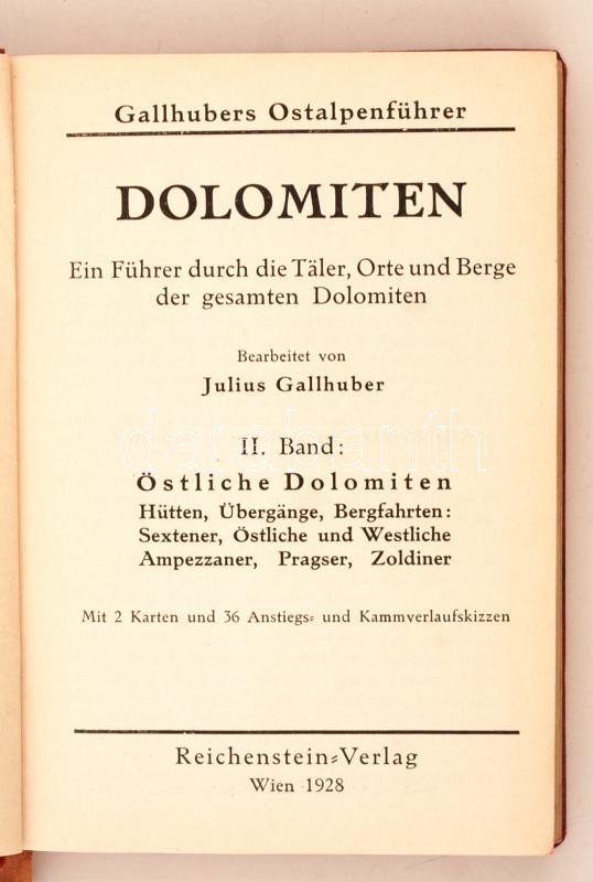 Description: Gallhuber, Julius: Dolomiten. Ein Führer durch die Täler, Orte und Berge der gesamten Dolomiten. 2. köt.: Östliche Dolomiten. Bécs, 1928, Reichenstein Verlag. Térképmelléklettel. Kopott vászonkötésben, egyébként jó állapotban.