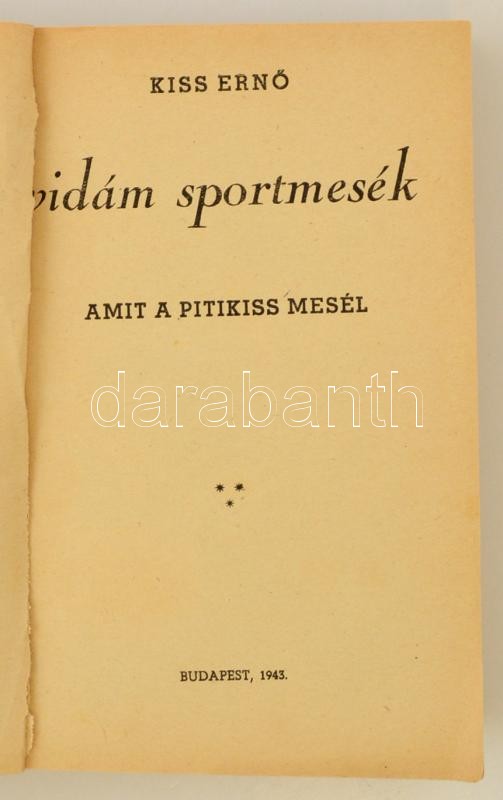 Kiss Ernő: Vidám sportmesék. Amit a PitiKiss mesél. Bp., 1943, Klein-ny. Javított papírkötéssel, a borítója hiányzik.