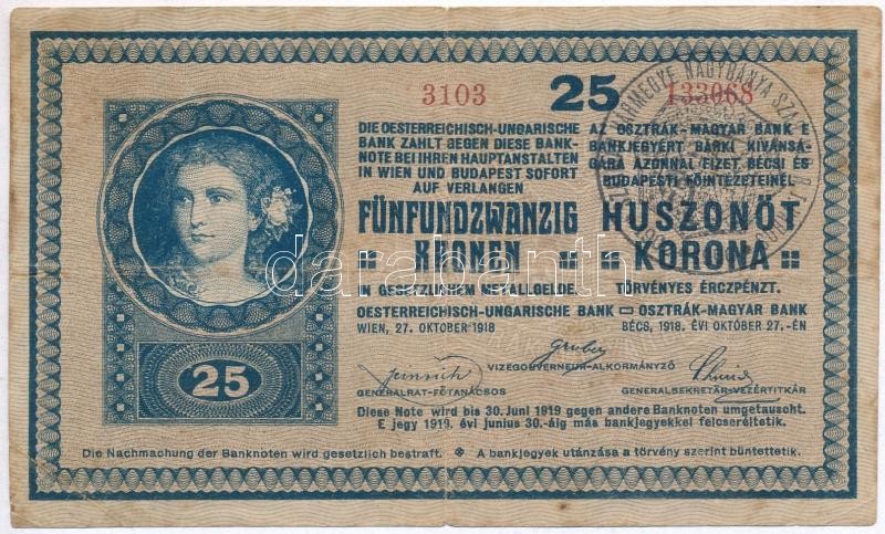 Description: 1918. 25K "3103" 3mm, hullámos hátlappal, előlapján hamis "Szatmár Vármegye Nagybánya Szab. Kir. R. T. Város" felülbélyegzéssel (fake overprint) T:III,III-