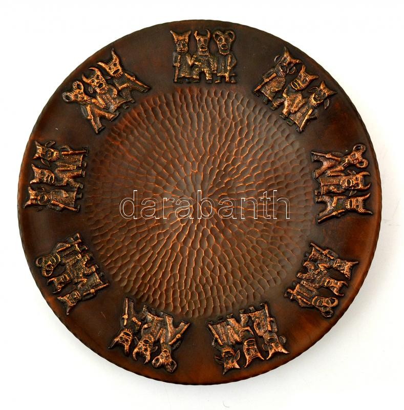 Busómotívumos iparművészeti réz dísztál, d: 31 cm