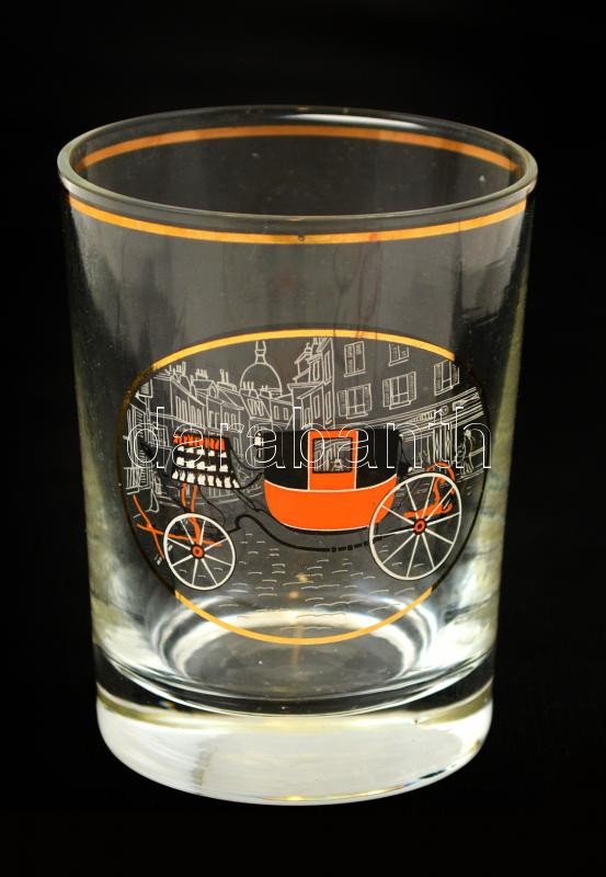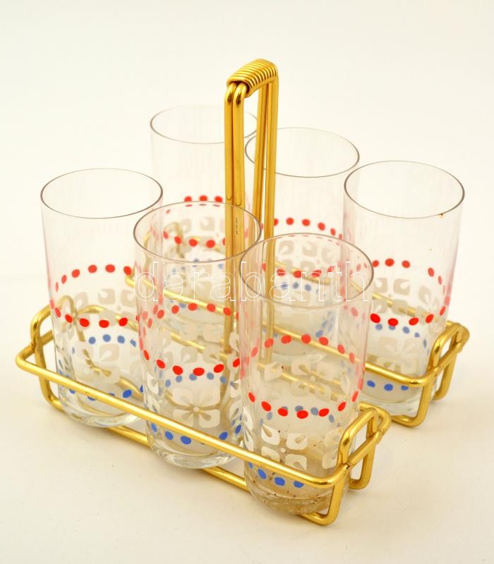 Retró pohárkészlet, 6 db, matricás, jelzés nélkül, az egyik kis csorbával, fém tartóval, d: 4,5 cm + hintóval díszített vizespohár, matricás, jelzés nélkül, d: 7 cm