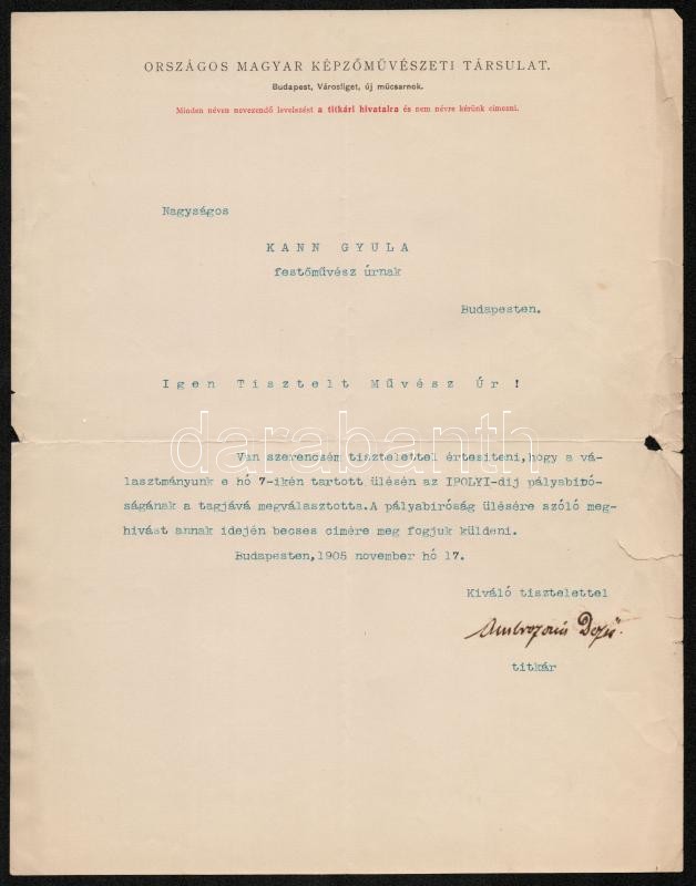 1905 Bp., Kosztolányi-Kann Gyula(1868-1945) festő és építésznek címzett levél az Országos Magyar Képzőművészeti Társulat fejléces levélpapírján
