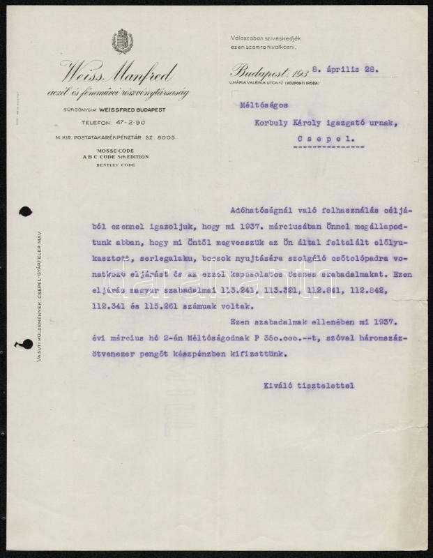 1937 A Weiss Manfréd gyár és Korbuly Károly közötti csőszabadalmi szer... https://www.darabanth.com/en/294-Online-auction/294.0/Other-collectibles/Historical-documents-manuscripts~200017/1937-A-Weiss-Manfred-gyar-es-Korbuly-Karoly-kozotti-csoszabadalmi-szerzodes-Korbuly-keso~II1560428