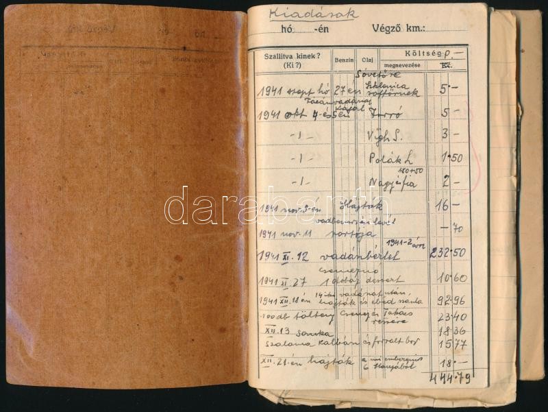 1941-1942 Vadászati társaság könyvecskéje, dokumentumai, Nemeskajal, számos bejegyzéssel kiadásokról, bevételről.