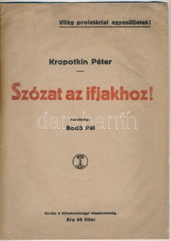 https://www.darabanth.com/en/294-Online-auction/294.0/Other-collectibles/Historical-documents-manuscripts~200017/cca-1919-Kropotkin-Peter-Szozat-az-ifjakhoz-kiadja-a-Kozoktatasugyi-Nepbiztossag-Jokai-C3~II1559700