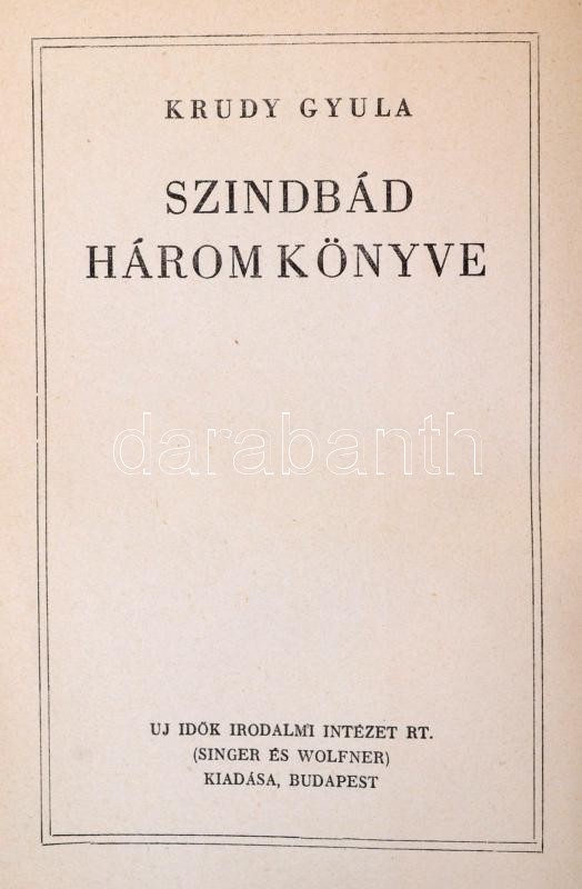 Krúdy Gyula: Szindbád három könyve. Bp.,(1944), Uj Idők Irodalmi Intéz... https://www.darabanth.com/en/295-Online-auction/295.0/Books/Books-Other-rarities~500017/Krudy-Gyula-Szindbad-harom-konyve-Bp-1944-Uj-Idok-Irodalmi-Intezet-Singer-es-Wolnfer-~II1570454
