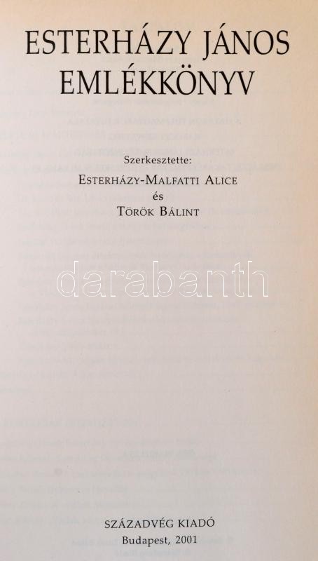 Esterházy János emlékkönyv. Szerk.: Esterházy-Malfatti Alice és Török Bálint. Bp., 2001, Századvég. Kiadói kartonált papírkötés.