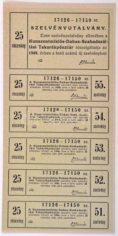 Kunszentmiklós 1927. "Kunszentmiklós-Dabas-Szabadszállási Takarékpénztár" huszonöt részvénye egyben összesen 250P-ről, szárazpecséttel, szelvényekkel T:II