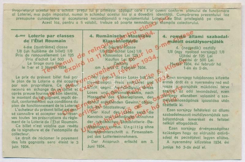 Románia 1934. "Loteria de Stat Romania" Román Állami Lottó negyedik os... https://www.darabanth.com/en/295-Online-auction/295.0/Numismatics/Shares-and-Tickets~400005/Romania-1934-Loteria-de-Stat-Romania-Roman-Allami-Lotto-negyedik-osztaly-egy-nyolcad-sorsjeg~II1565979