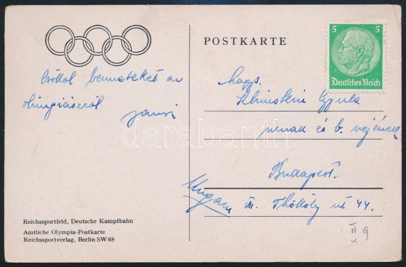 1936 Az olimpia bajnok magyar vízilabdázó Németh János hazaküldött képeslapja a Berlini Olimpiáról