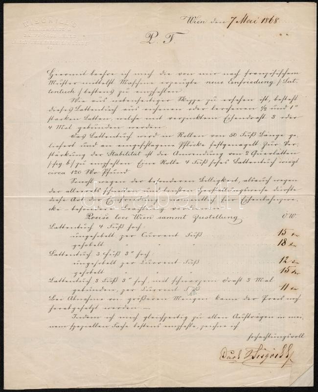 1868 Bécs, Wisgrill's német nyelvű számla