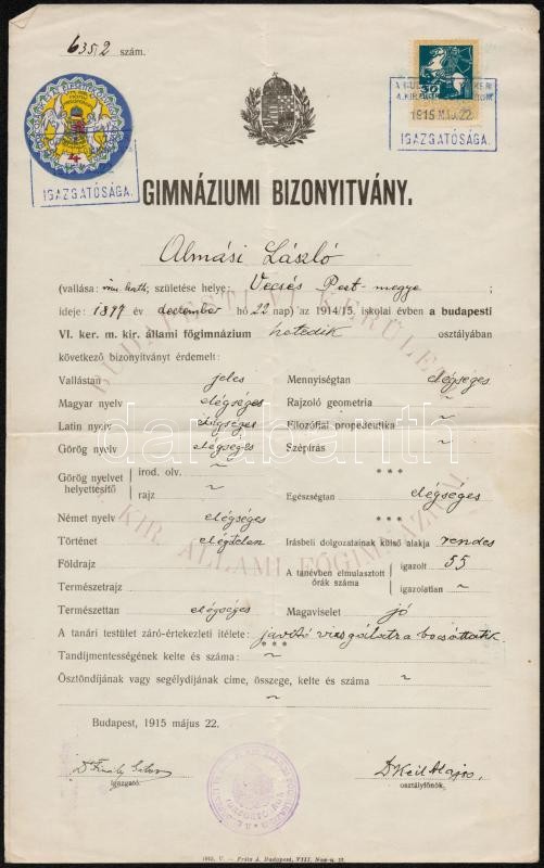 1915 Bp., A budapesti VI. ker. m. kir. állami főgimnáziuma által kiállított gimnáziumi bizonyítvány okmánybélyeggel