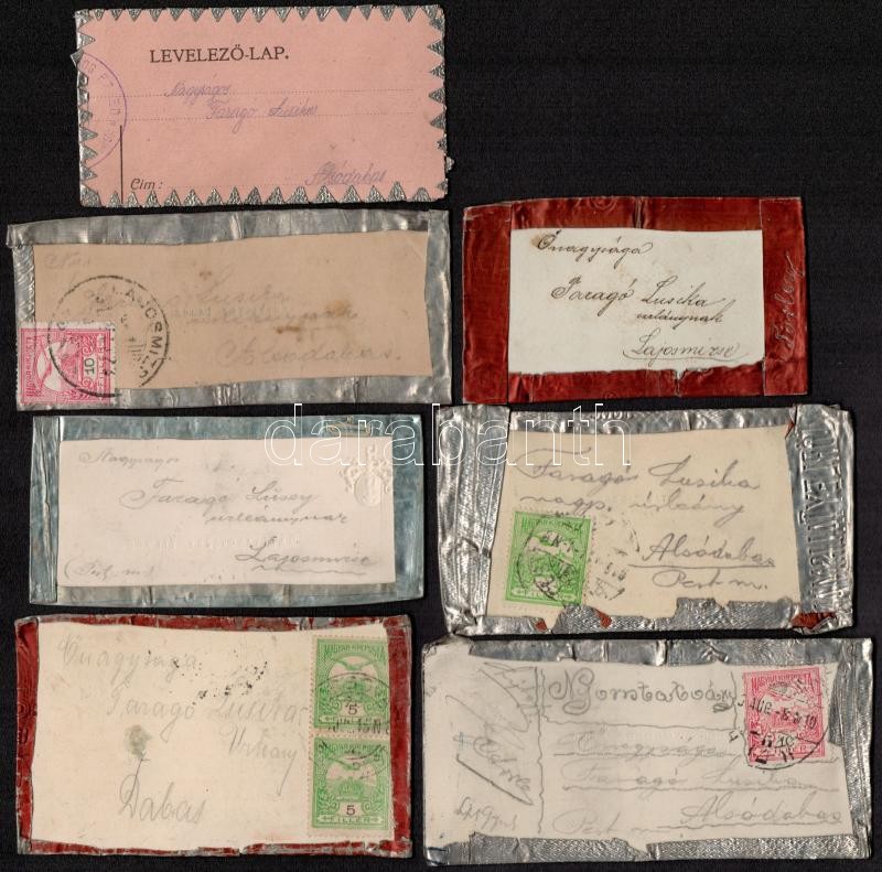 Description: 1902 Egy víg társaság üzenetei egy kedvelt hölgynek. Fiatalemberek pezsgő dugó csomagoló fémpapírokba burkolt névjegykártyái felbélyegezve, postán elküldve egy hölgy címére, egyik céglyukasztásos 7 db