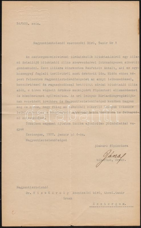 1922 Esztergom, Csernoch János (1852-1927) bíboros saját kézzel aláírt... https://www.darabanth.com/en/295-Online-auction/295.0/Other-collectibles/Historical-documents-manuscripts~200019/1922-Esztergom-Csernoch-Janos-1852-1927-biboros-sajat-kezzel-alairt-levele-dr-Kiss-Karoly~II1570048