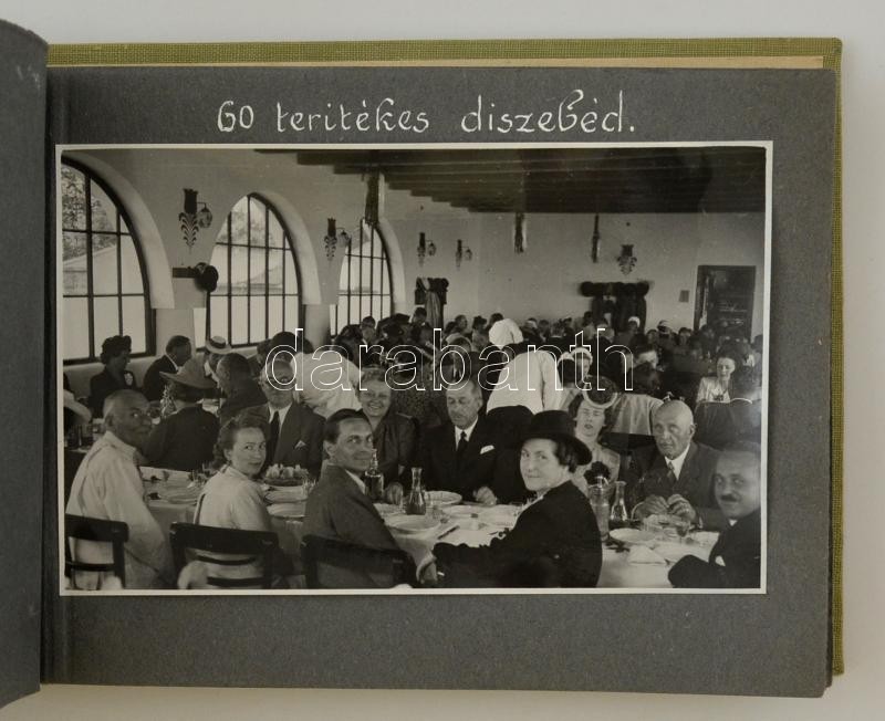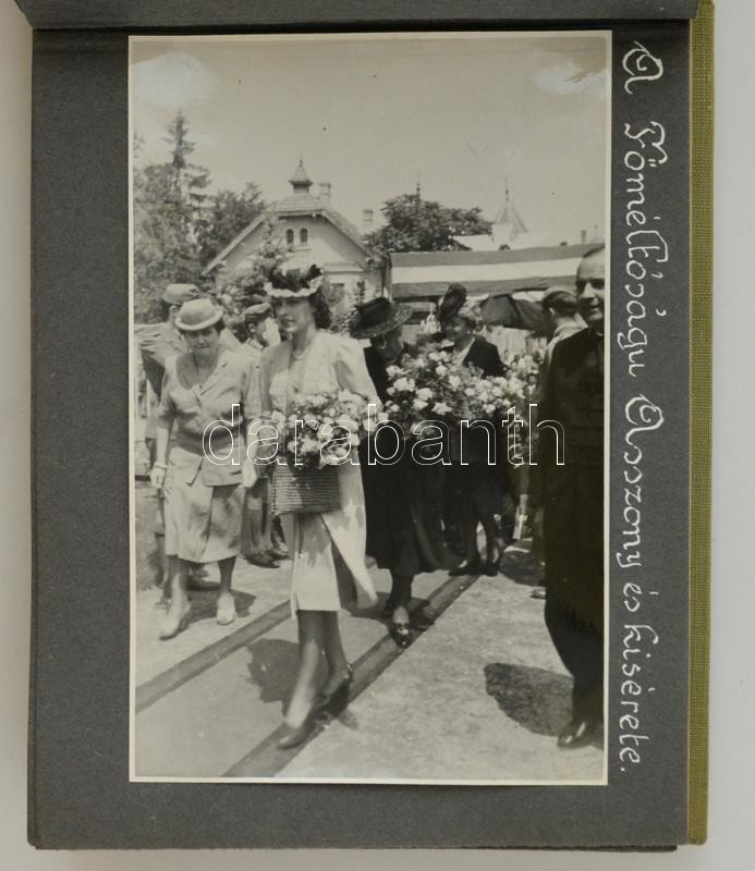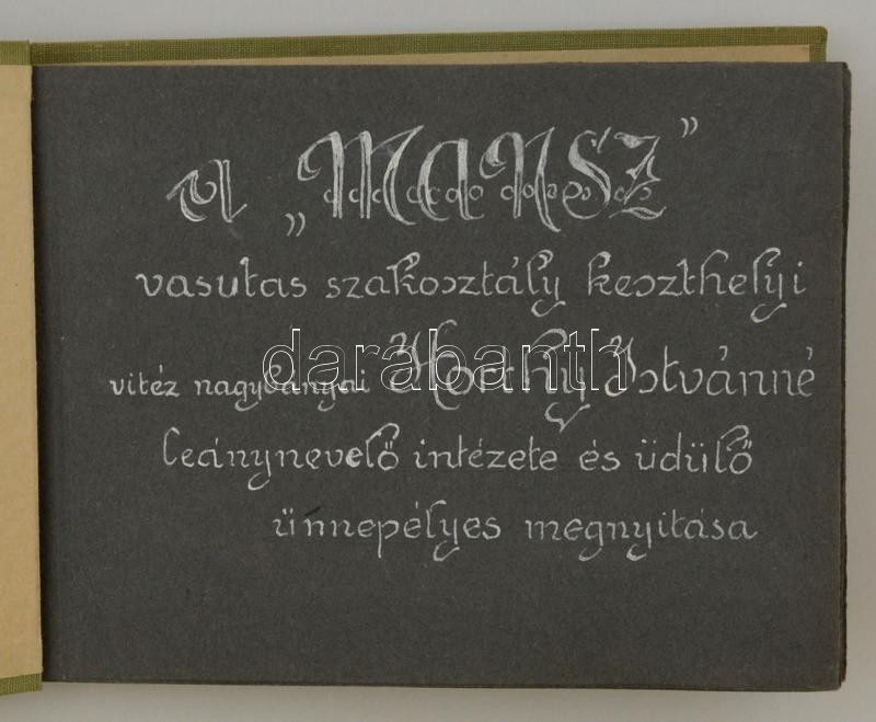 Description: cca 1940 A "MANSZ" [Magyar Asszonyok Nemzeti Szövetsége] vasutas szakosztály keszthelyi vitéz nagybányai Horthy Istvánné leánynevelő intézete és üdülő ünnepélyes megnyitása, 31 db fotó albumba rendezve, feliratozva, 8,5×14 cm