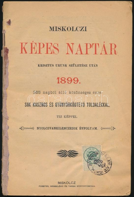 1899 Miskolci képes naptár Krisztus urunk születése után 1899. 365 napból álló közönséges évre sok hasznos és gyönyörködtető toldalékkal