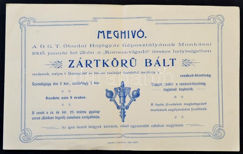 1905 Meghívó az Első Duna-Gőzhajózási Társág (DGT) Óbudai Hajógyár zártkörű báljára, magyar és német nyelven, 14,5x23,5 cm