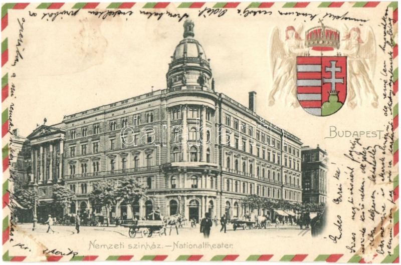 Budapest VIII. Nemzeti színház, angyalos címer, Emb. (vágott / cut)
