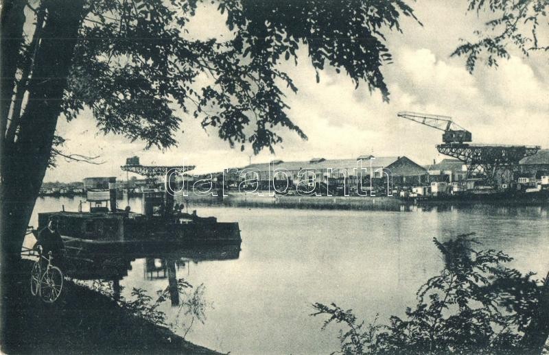 Komárom, Komarno; Dunai kikötő darukkal, kerékpáros / port with cranes...