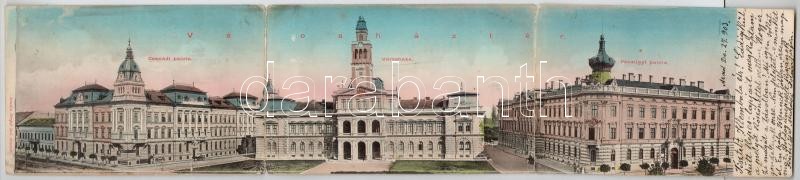 Arad, Városház tér, Csanádi palota, Pénzügyi palota; 3-részes panorámalap, Kerpel Izsó kiadása / town hall, financial palace, 3-tiled panoramacard (r)