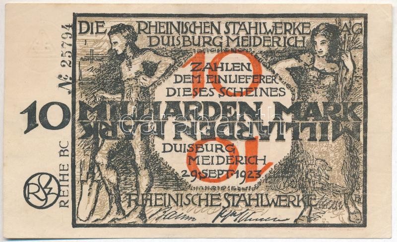 Németország / Weimari Köztársaság / Duisburg Meidenrich 1923. 10.000.000.000M szükségpénz vízjeles papíron, szárazpecséttel T:II-,III