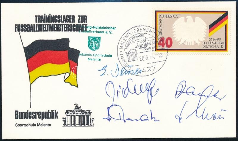 1974 A későbbi világbajnok német focicsapat edzőtáborának emlékborítékja a csapat 5 tagjának aláírásával