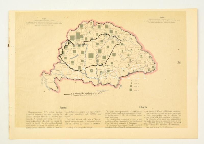 Description: cca 1920 Árpatermesztés Magyarországon megyénként 1913-ban, a "Magyarország gazdasági térképekben" kiadványból, magyar és francia magyarázó szöveggel, a trianoni határok feltüntetésével, 26,5×37,5 cm