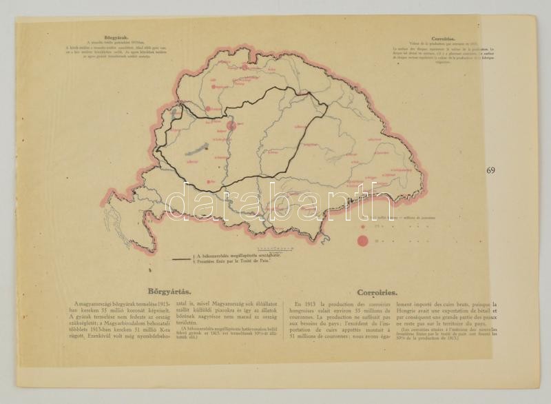 Description: cca 1920 Bőrgyárak Magyarországon 1913-ban, a "Magyarország gazdasági térképekben" kiadványból, magyar és francia magyarázó szöveggel, a trianoni határok feltüntetésével, 26,5×37,5 cm