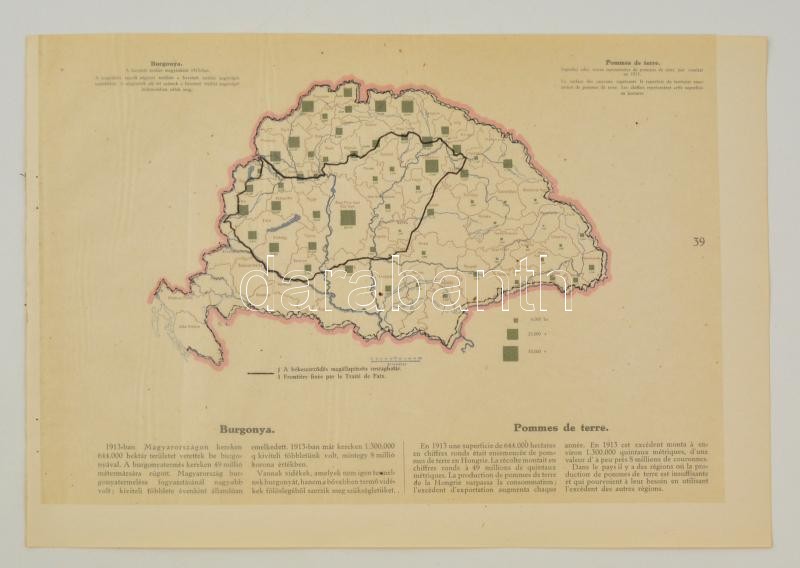 Description: cca 1920 Burgonyatermelés megyénként 1913-ban, a "Magyarország gazdasági térképekben" kiadványból, magyar és francia magyarázó szöveggel, a trianoni határok feltüntetésével, 26,5×37,5 cm