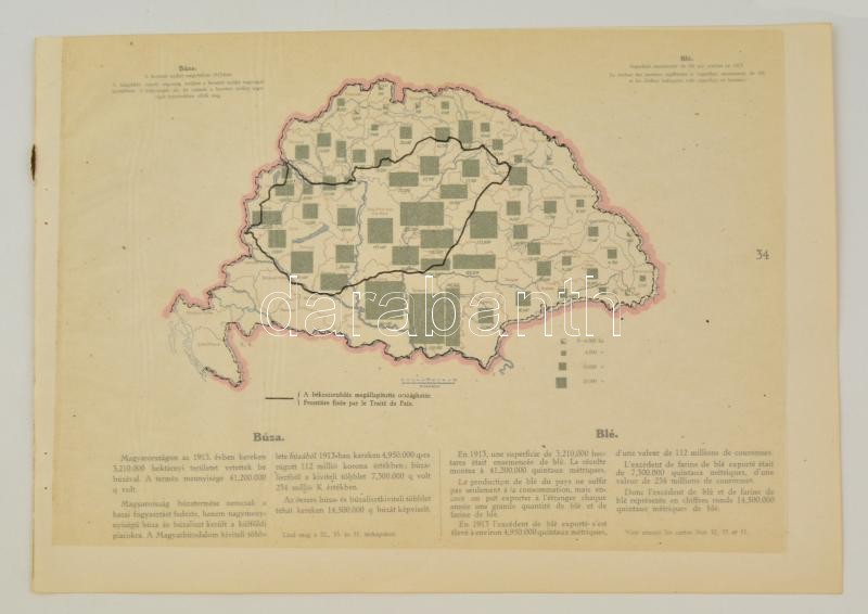Description: cca 1920 Búzatermesztés Magyarországon megyénként 1913-ban, a "Magyarország gazdasági térképekben" kiadványból, magyar és francia magyarázó szöveggel, a trianoni határok feltüntetésével, 26,5×37,5 cm