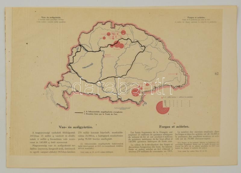 Description: cca 1920 Vas- és acélgyártás Magyarországon 1913-ban, a "Magyarország gazdasági térképekben" kiadványból, magyar és francia magyarázó szöveggel, a trianoni határok feltüntetésével, 26,5×37,5 cm